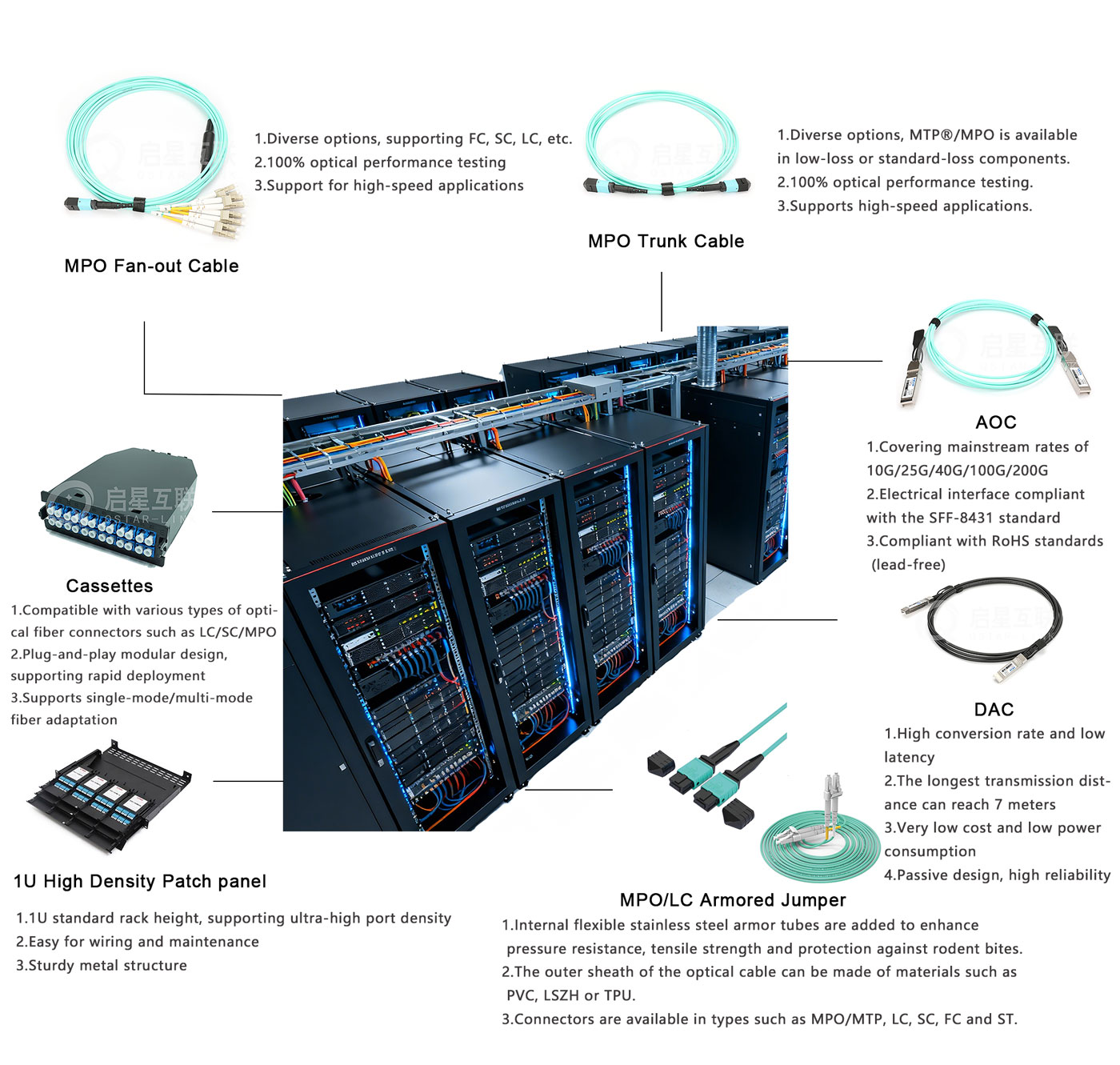 Qixing Interconnect relies on professional design capabilities and exquisite craftsmanship to provide you with a comprehensive range of high-density and high-performance fiber optic connection products, including MPO jumpers, AOC, DAC, LC/SC jumpers MT-FA、 Pre terminated fiber optic cable components and supporting distribution frames, etc.
